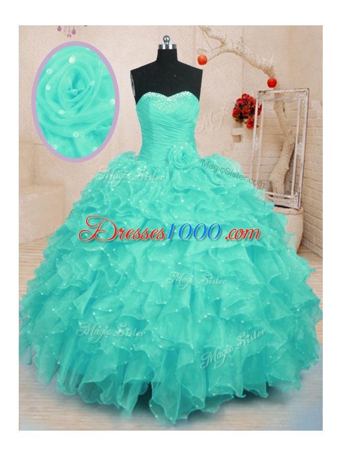 Cheap Turquoise Organza Lace Up Sweet 16 Quinceanera Dress Sleeveless Floor Length Beading and Ruffles and Hand Made Flower