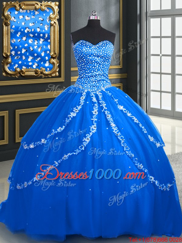 Trendy Tulle Sweetheart Sleeveless Brush Train Lace Up Beading and Appliques Quinceanera Dress in Blue