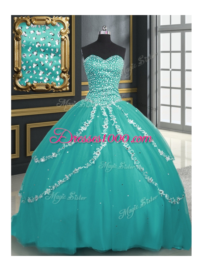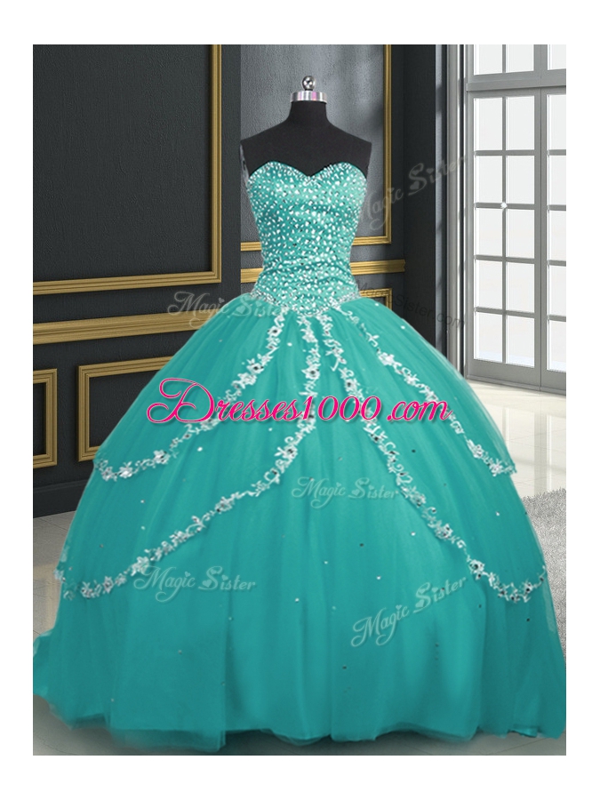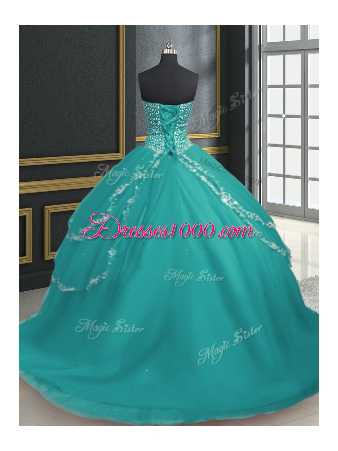 Attractive Sweetheart Sleeveless 15th Birthday Dress With Brush Train Beading and Appliques Turquoise Tulle