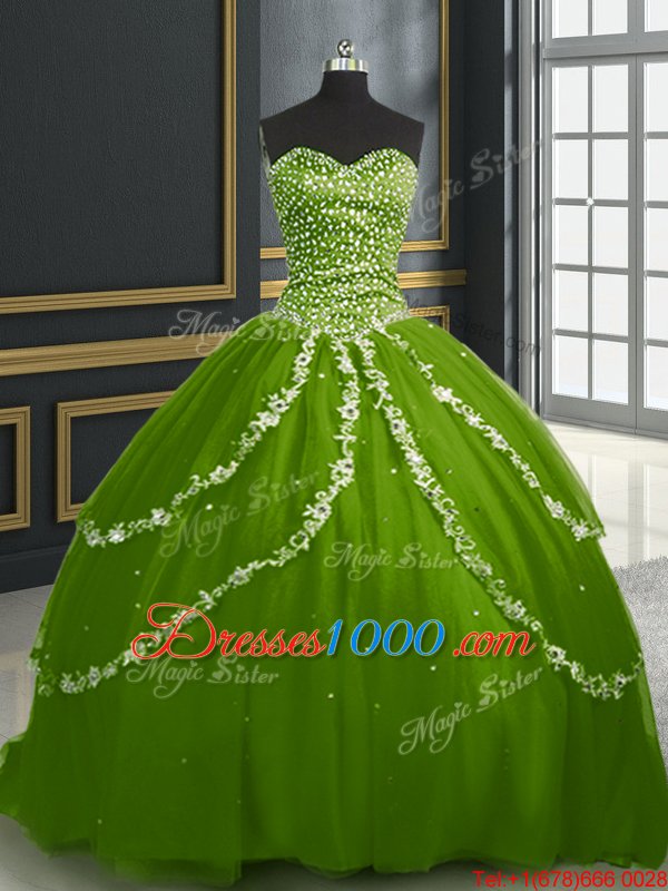 Cheap With Train Olive Green Quince Ball Gowns Tulle Brush Train Sleeveless Beading and Appliques