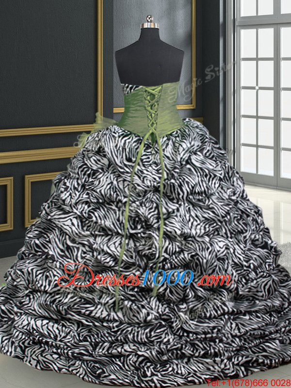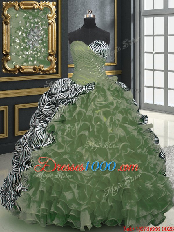 Classical Olive Green Ball Gowns Sweetheart Sleeveless Organza and Printed With Brush Train Lace Up Beading and Ruffles and Pattern Quinceanera Dress