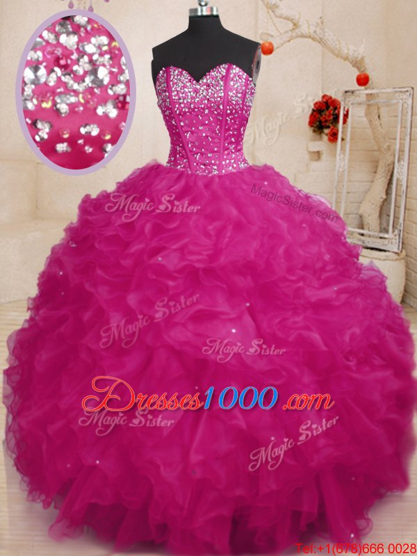 Fuchsia Lace Up Sweetheart Beading and Ruffles 15th Birthday Dress Organza Sleeveless