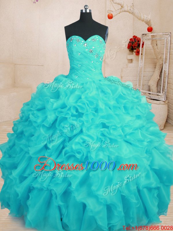 Adorable Beading and Ruffles Sweet 16 Dress Aqua Blue Lace Up Sleeveless Floor Length