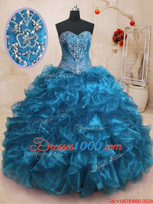 Hot Selling Blue Organza Lace Up Quince Ball Gowns Sleeveless With Train Sweep Train Beading and Ruffles