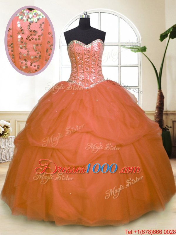 Orange Ball Gowns Sequins and Pick Ups Sweet 16 Quinceanera Dress Zipper Tulle Sleeveless Floor Length