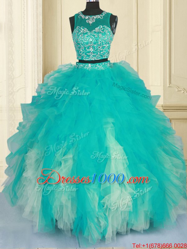 Scoop Sleeveless Tulle Floor Length Zipper Vestidos de Quinceanera in Turquoise for with Beading and Ruffles