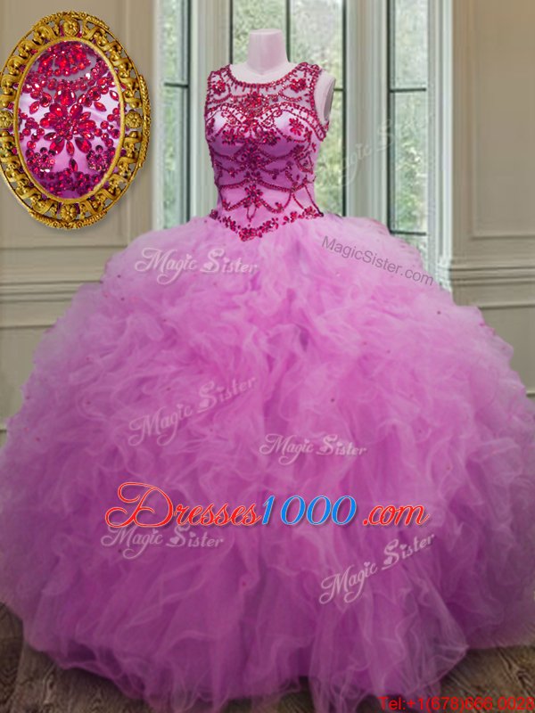 Scoop Floor Length Lace Up Sweet 16 Dresses Lilac and In for Military Ball and Sweet 16 and Quinceanera with Beading and Ruffles