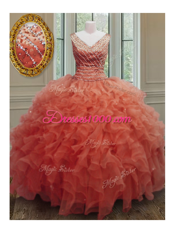 Graceful V-neck Sleeveless Organza 15 Quinceanera Dress Beading and Ruffles Zipper