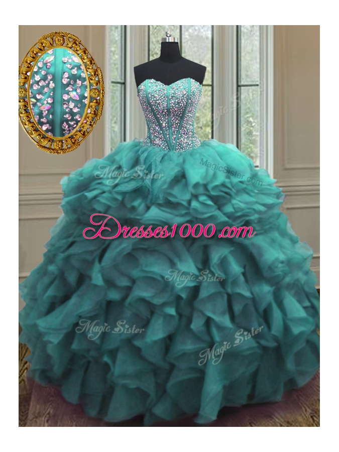 Artistic Turquoise 15 Quinceanera Dress Military Ball and Sweet 16 and Quinceanera and For with Beading and Ruffles Sweetheart Sleeveless Lace Up