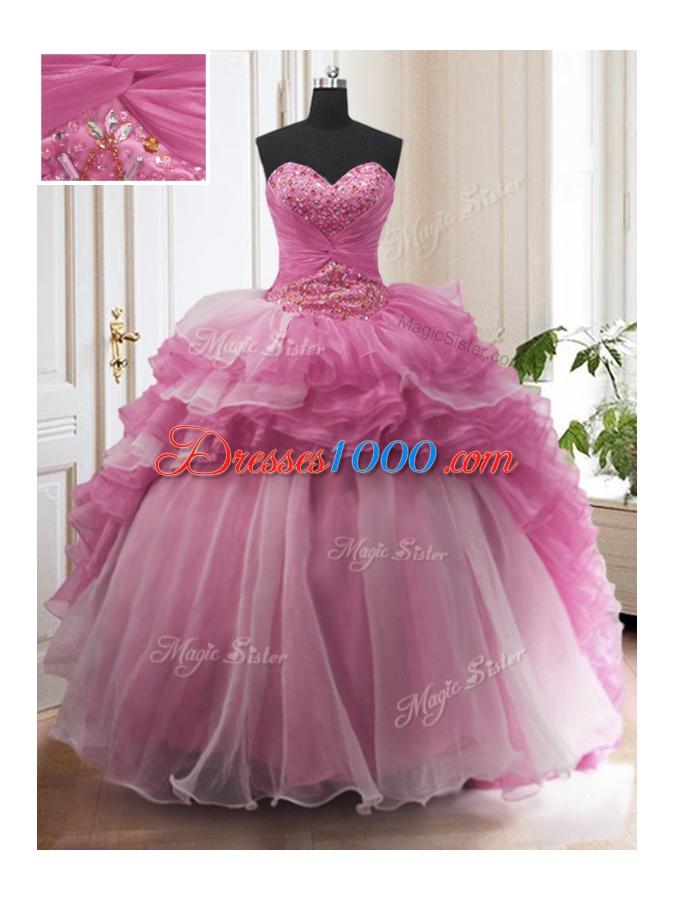 Ruffled With Train Rose Pink Ball Gown Prom Dress Sweetheart Sleeveless Sweep Train Lace Up
