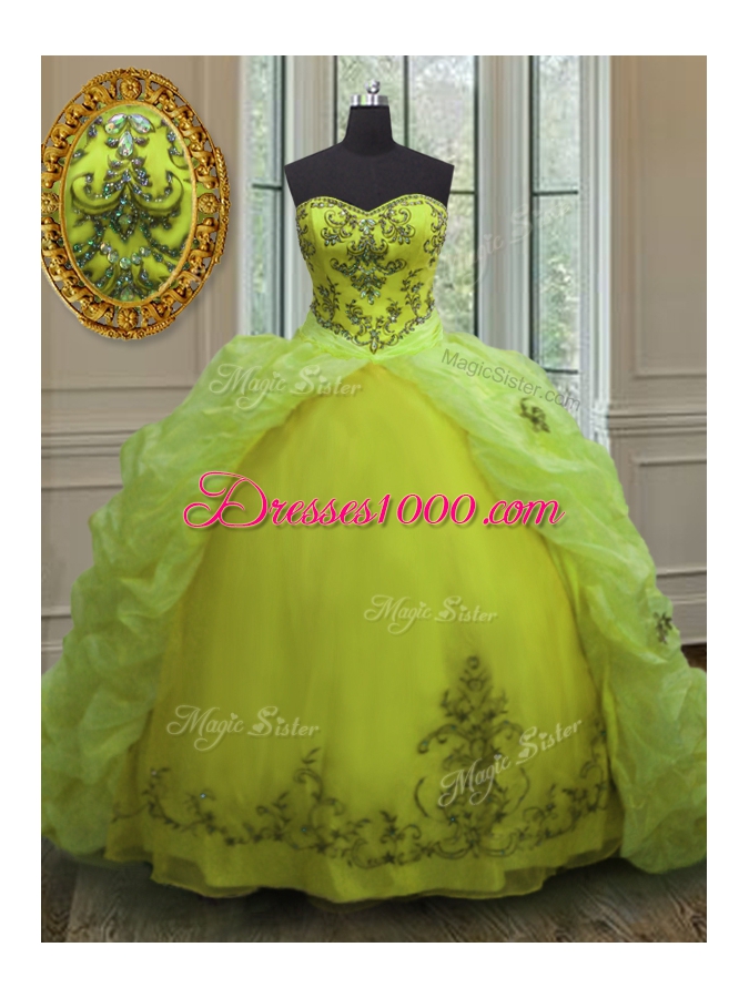 Charming Yellow Green Quinceanera Dresses Military Ball and Sweet 16 and Quinceanera and For with Beading and Appliques and Pick Ups Sweetheart Sleeveless Court Train Lace Up
