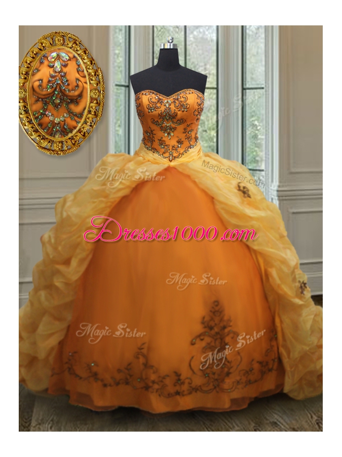 With Train Orange Ball Gown Prom Dress Organza Court Train Sleeveless Beading and Appliques and Pick Ups