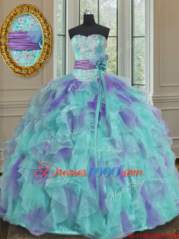 Custom Design Sweetheart Sleeveless Organza Sweet 16 Dresses Beading and Appliques and Ruffles and Sashes|ribbons and Hand Made Flower Lace Up