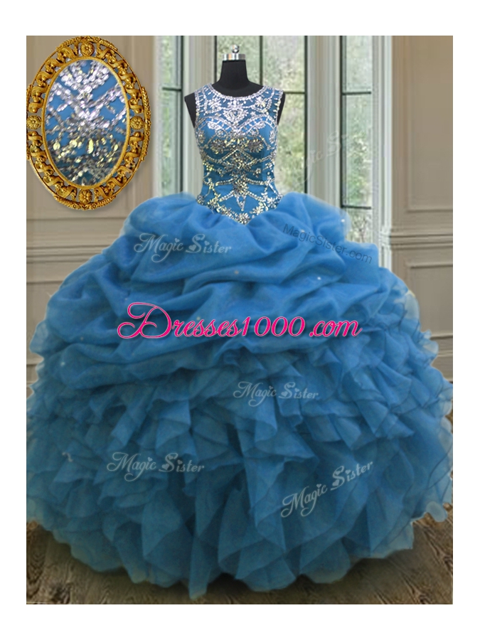 Classical Blue Scoop Neckline Beading and Ruffles and Pick Ups Quinceanera Dresses Sleeveless Lace Up