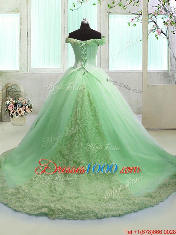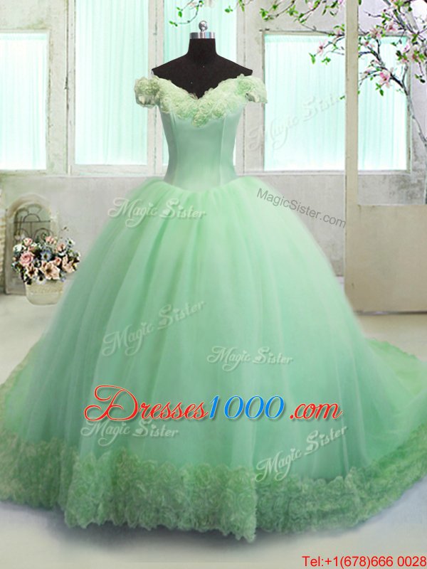 New Style Off The Shoulder Neckline Hand Made Flower Quince Ball Gowns Short Sleeves Lace Up