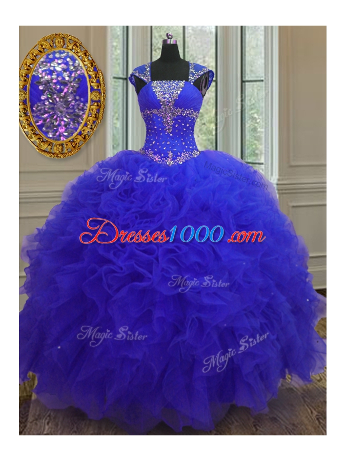 Popular Straps Straps Sequins High Low Ball Gowns Cap Sleeves Blue Quinceanera Dress Lace Up