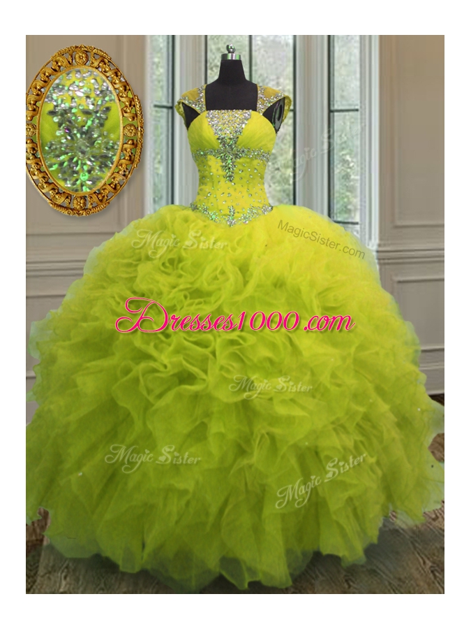 Straps Straps Beading and Ruffles and Sequins Quince Ball Gowns Yellow Green Lace Up Cap Sleeves Floor Length