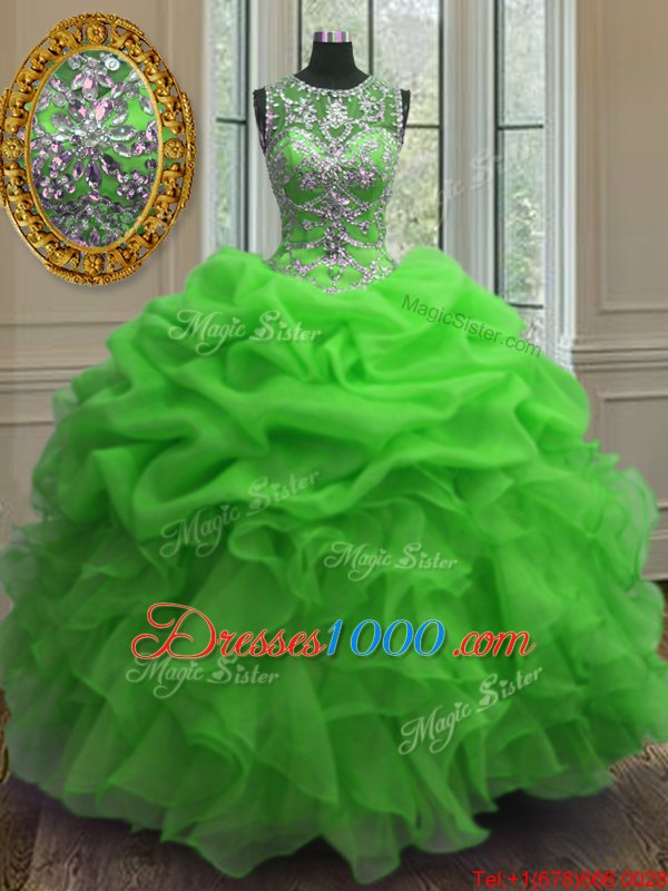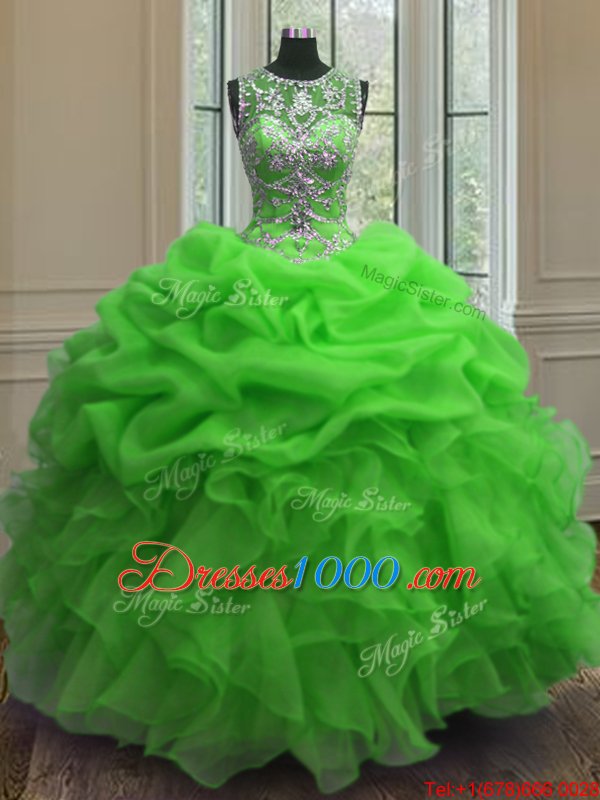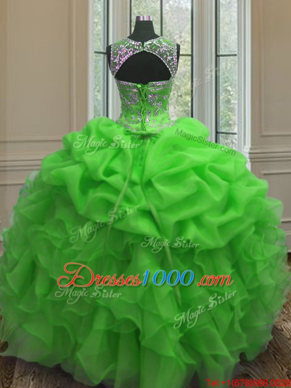 Scoop Sleeveless Sweet 16 Dresses Floor Length Beading and Ruffles and Pick Ups Green Organza