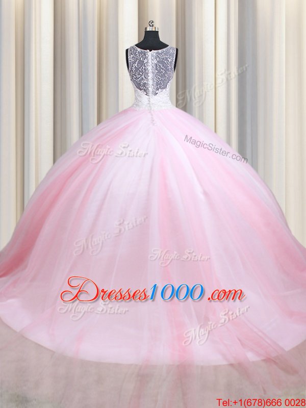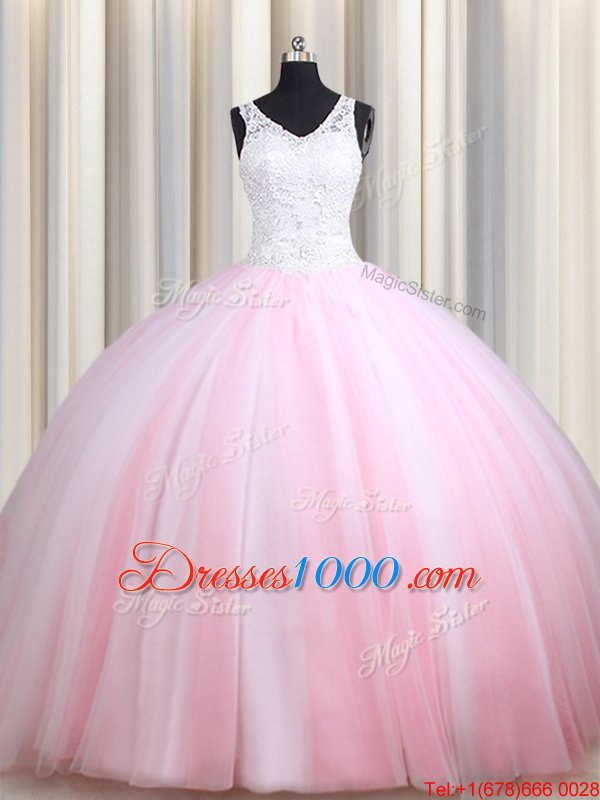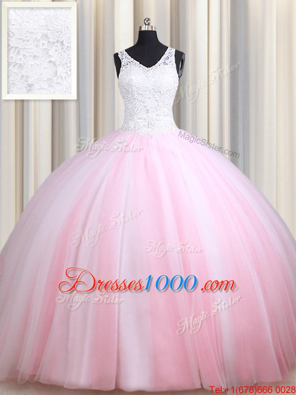 Dazzling Pink And White Straps Zipper Lace Quince Ball Gowns Sleeveless