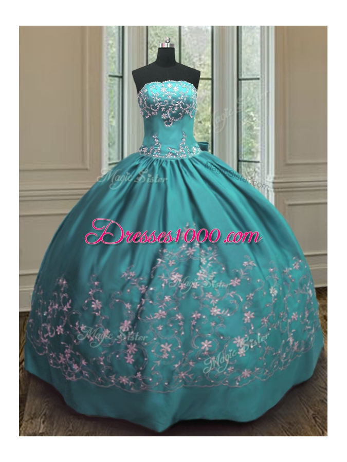 Vintage Satin Strapless Sleeveless Lace Up Embroidery Quinceanera Dress in Teal