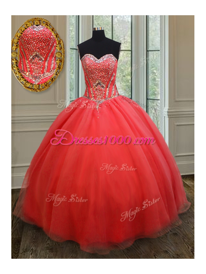 Floor Length Lace Up Sweet 16 Dress Coral Red and In for Military Ball and Sweet 16 and Quinceanera with Beading