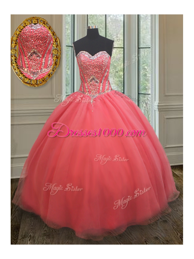 Romantic Watermelon Red Sleeveless Organza Lace Up Quinceanera Gown for Military Ball and Sweet 16 and Quinceanera