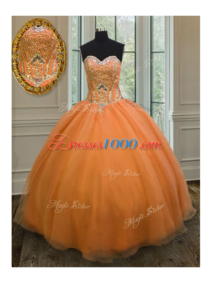 Popular Orange Sleeveless Floor Length Beading Lace Up Sweet 16 Dresses