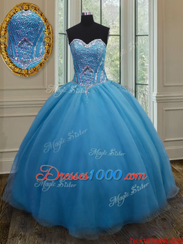 Sleeveless Floor Length Beading and Belt Lace Up Quince Ball Gowns with Baby Blue