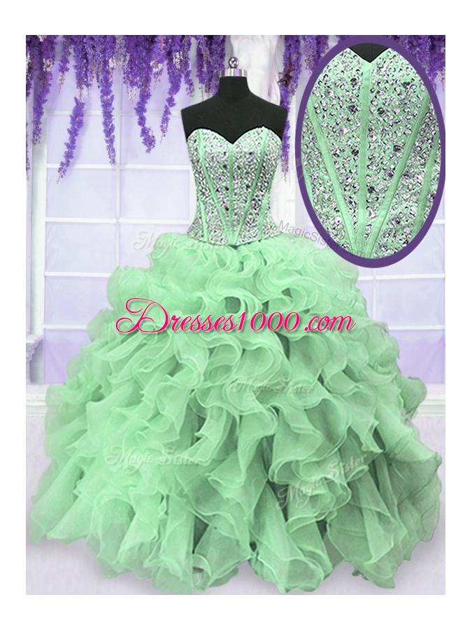Modern Apple Green Organza Lace Up Sweetheart Sleeveless Floor Length Sweet 16 Quinceanera Dress Beading and Ruffles