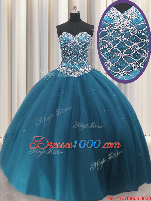Sweetheart Sleeveless Quinceanera Gown Floor Length Beading and Sequins Teal Tulle