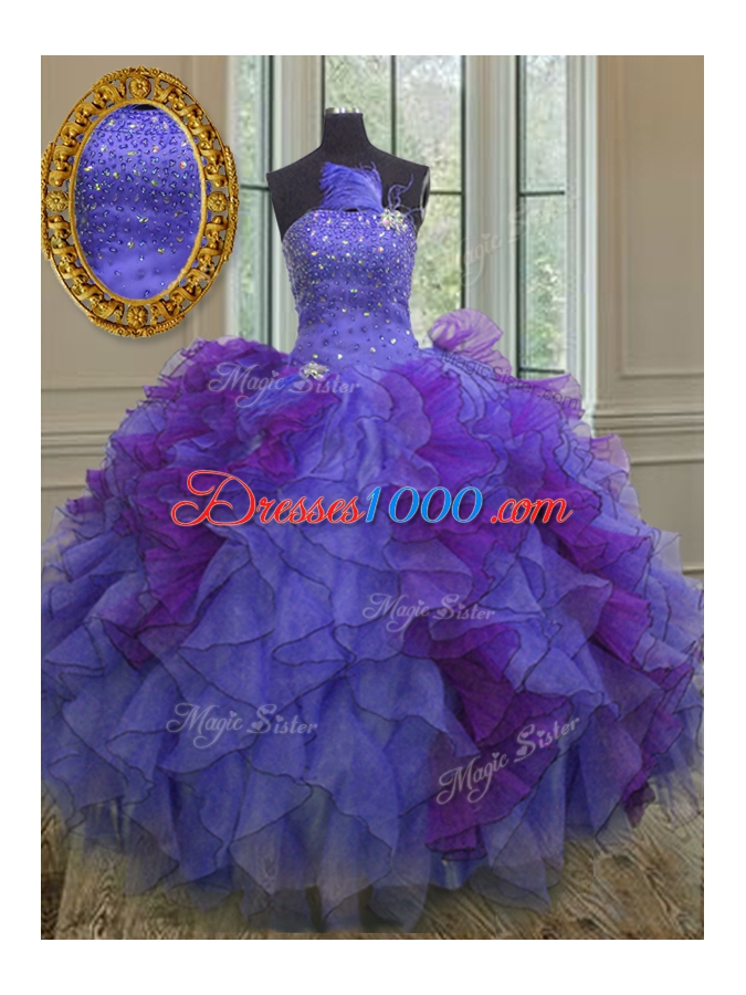 Glittering Halter Top Sleeveless Floor Length Beading and Ruffles Lace Up Quinceanera Gowns with Multi-color