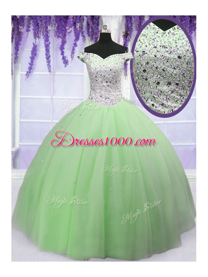 Beauteous Apple Green Ball Gowns Off The Shoulder Short Sleeves Tulle Floor Length Lace Up Beading Quinceanera Gown