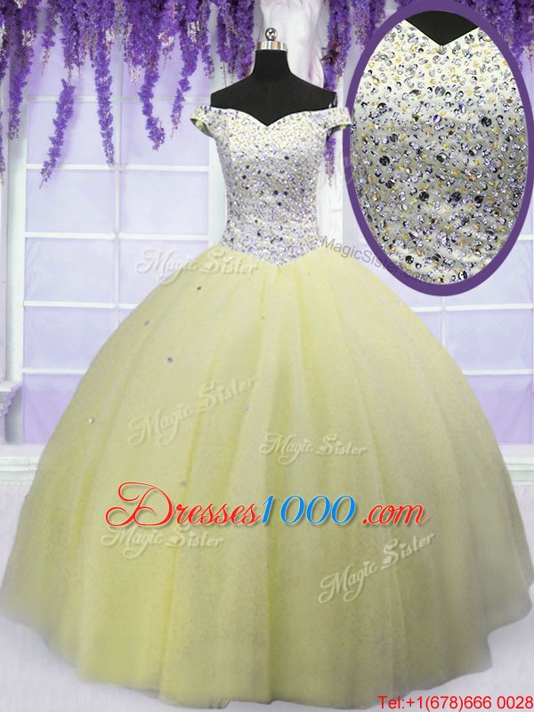 Free and Easy Light Yellow Off The Shoulder Lace Up Beading Sweet 16 Dress Short Sleeves