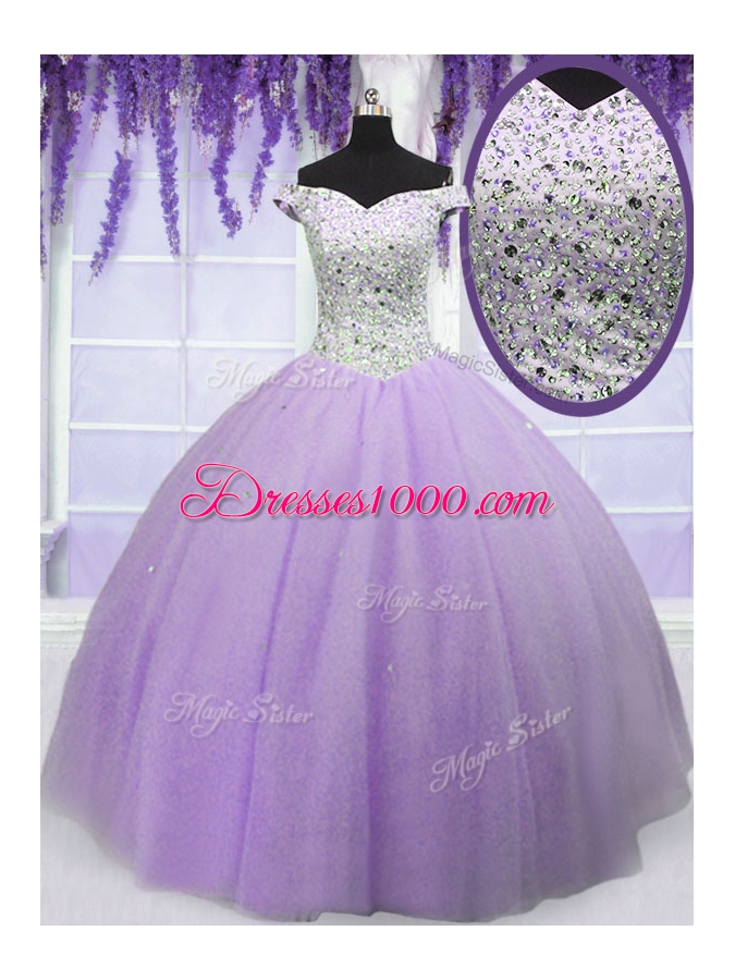 Off the Shoulder Short Sleeves Tulle Floor Length Lace Up Quinceanera Gowns in Lavender for with Beading