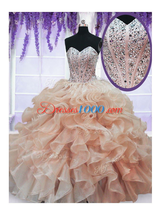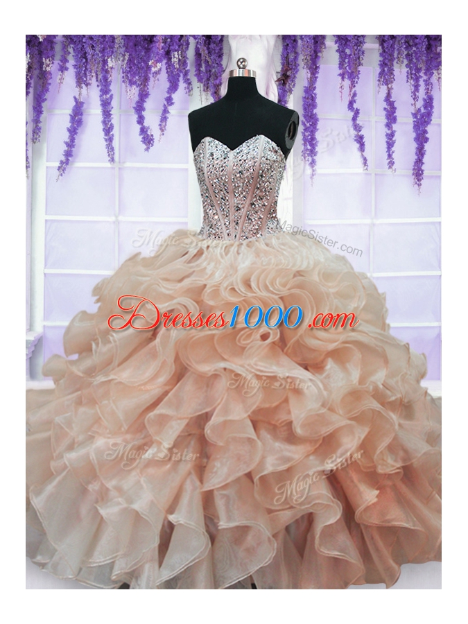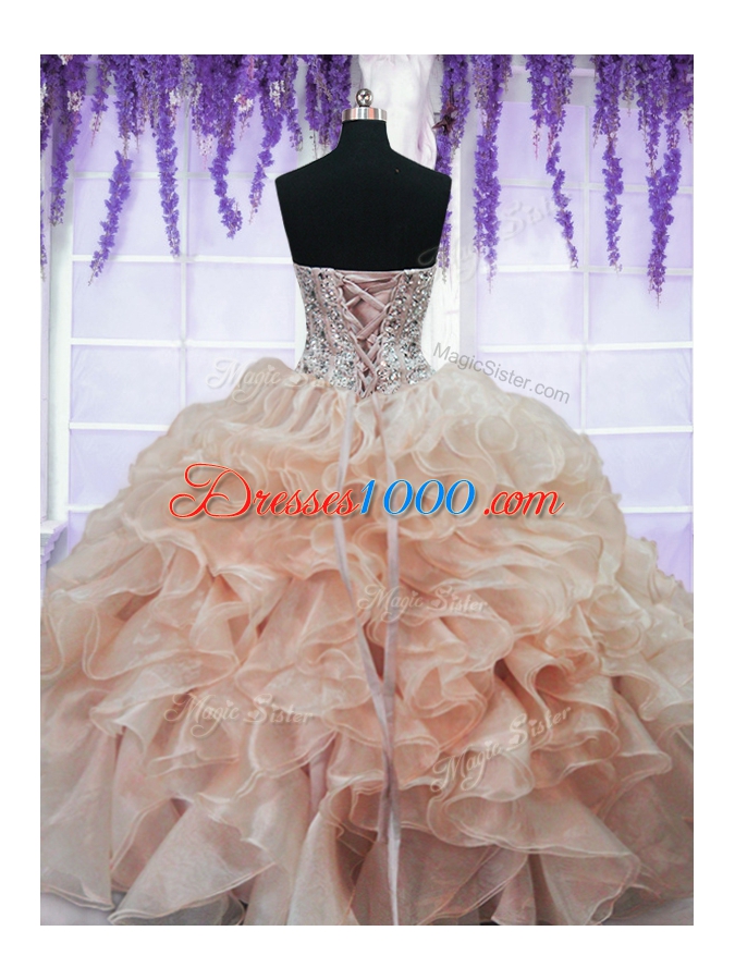 Trendy Peach Ball Gowns Organza Sweetheart Sleeveless Beading and Ruffles Floor Length Lace Up Sweet 16 Dresses
