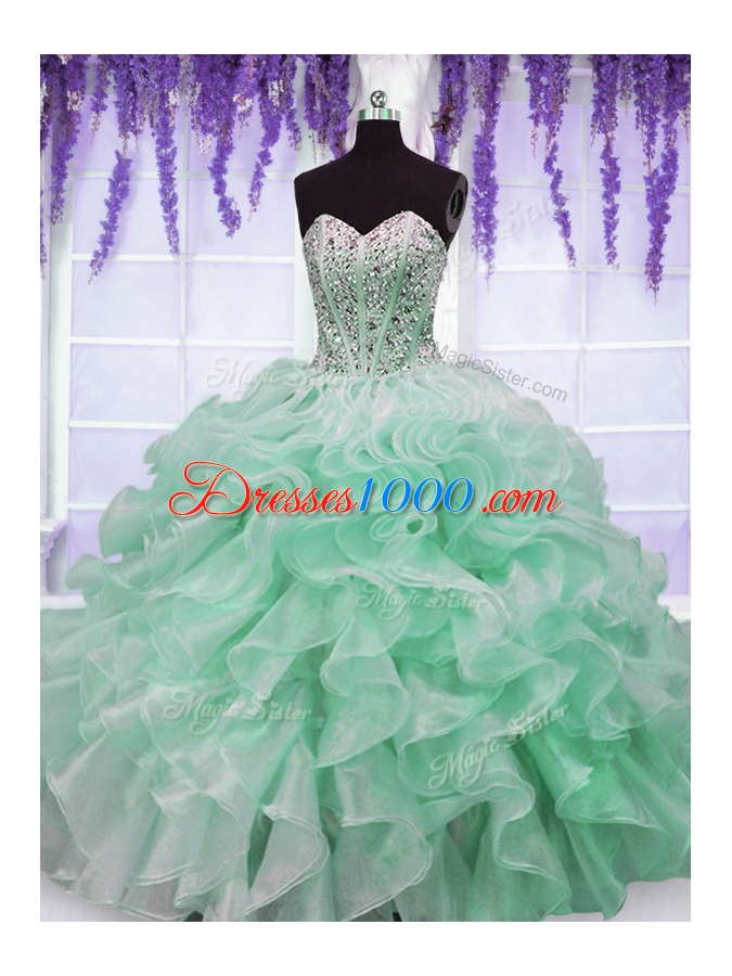Eye-catching Apple Green Ball Gowns Organza Sweetheart Sleeveless Beading and Ruffles Floor Length Lace Up 15 Quinceanera Dress