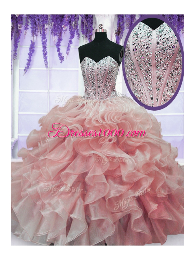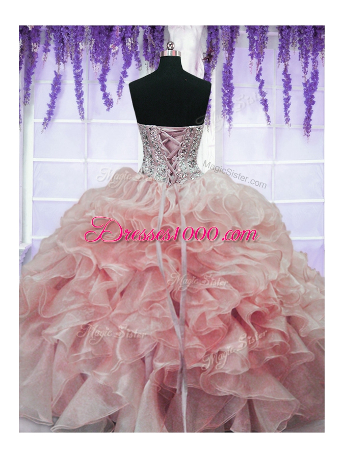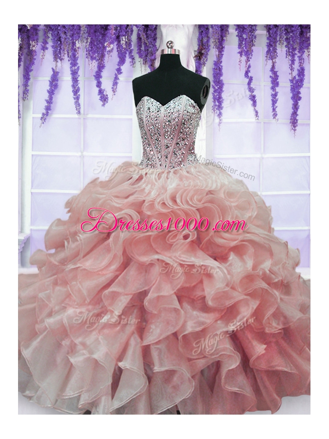 Watermelon Red Ball Gowns Organza Sweetheart Sleeveless Beading and Ruffles Floor Length Lace Up 15th Birthday Dress