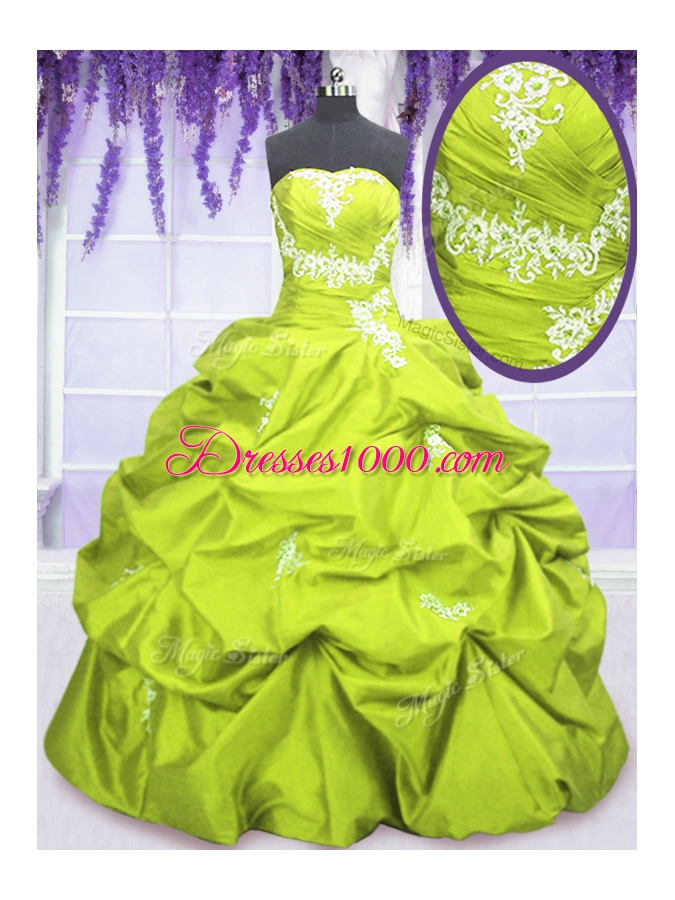 Yellow Green Ball Gowns Taffeta Strapless Sleeveless Appliques and Pick Ups Floor Length Lace Up Ball Gown Prom Dress