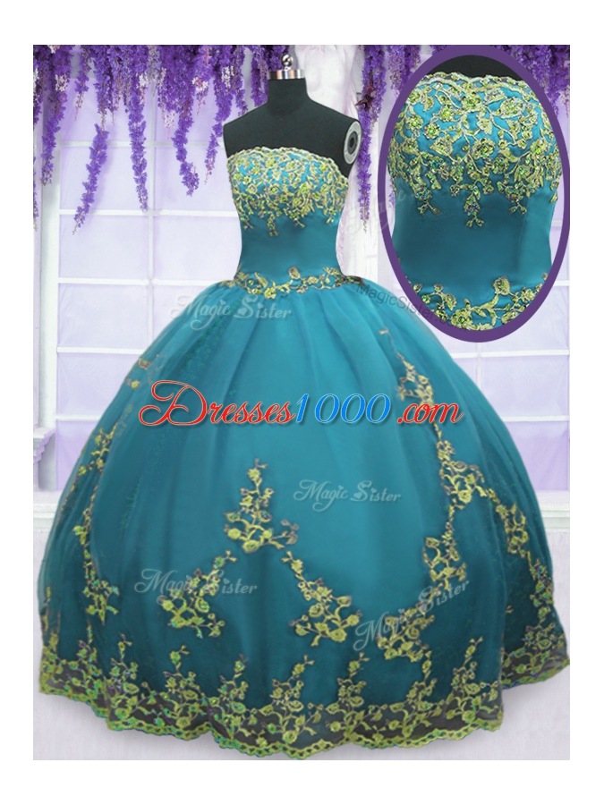 Teal Ball Gowns Appliques Ball Gown Prom Dress Zipper Tulle Sleeveless Floor Length