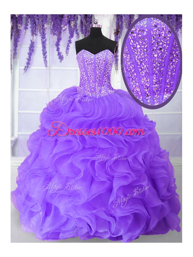 Hot Sale Purple Organza Lace Up Quinceanera Dress Sleeveless Floor Length Beading and Ruffles