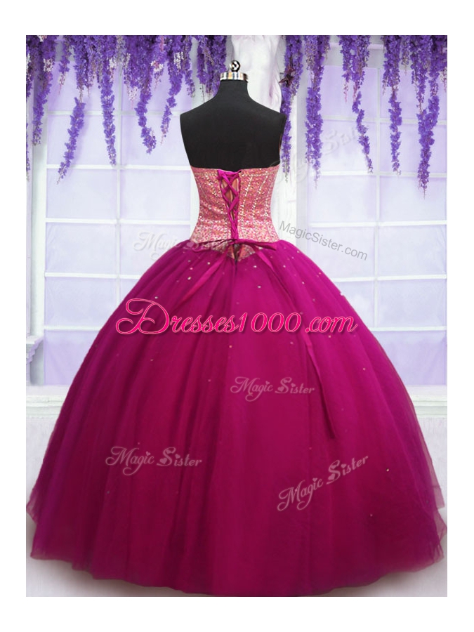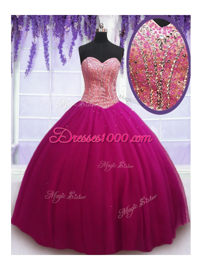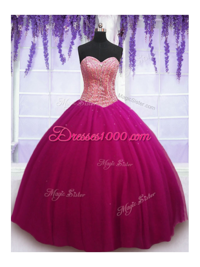 Captivating Floor Length Hot Pink Ball Gown Prom Dress Tulle Sleeveless Beading