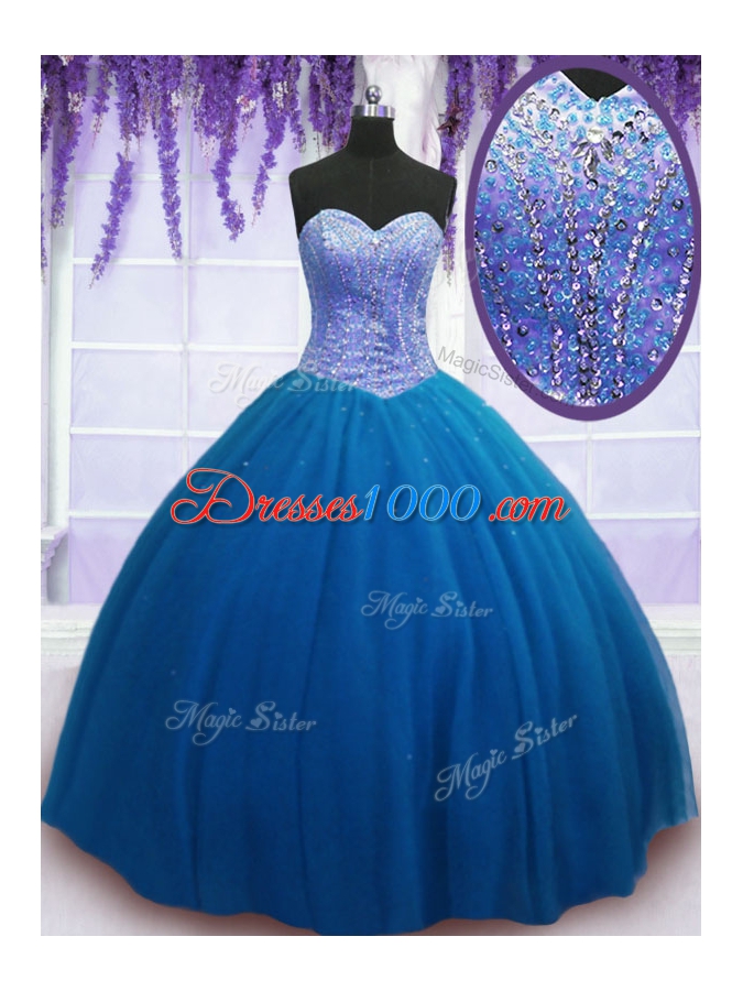 Teal Tulle Lace Up Sweet 16 Quinceanera Dress Sleeveless Floor Length Beading