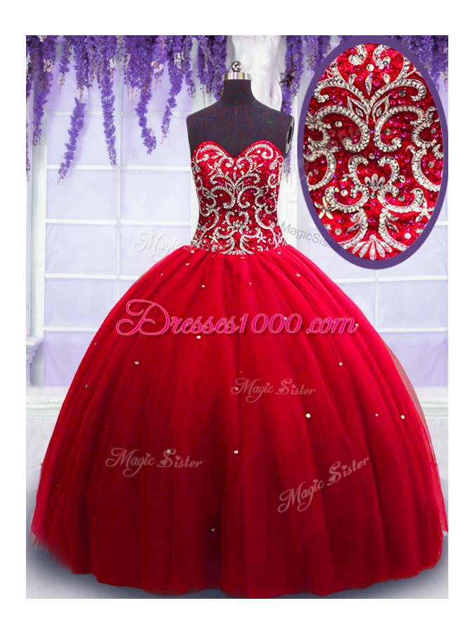 Fine Red Ball Gowns Sweetheart Sleeveless Tulle Floor Length Lace Up Beading Sweet 16 Quinceanera Dress
