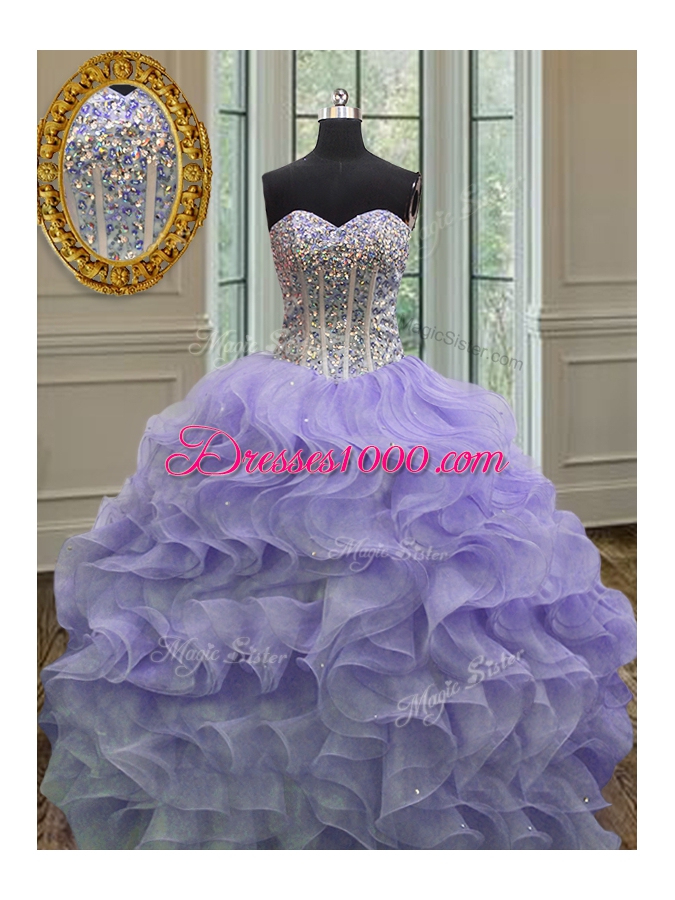 Lavender Sleeveless Floor Length Beading and Ruffles Lace Up Ball Gown Prom Dress
