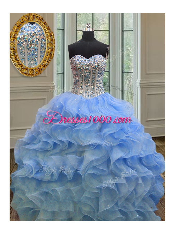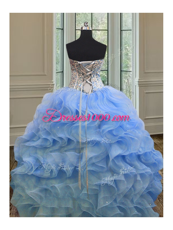 Sleeveless Organza Floor Length Lace Up Sweet 16 Dress in Blue for with Beading and Ruffles