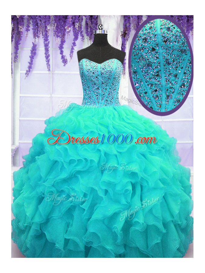 High Class Organza Sweetheart Sleeveless Lace Up Beading and Ruffles Vestidos de Quinceanera in Aqua Blue