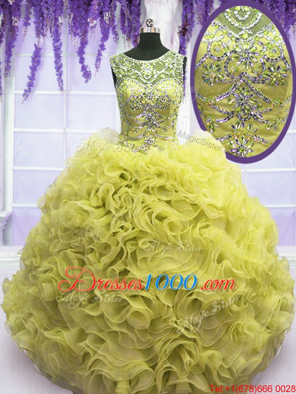 Enchanting Scoop Yellow Lace Up Ball Gown Prom Dress Beading and Ruffles Sleeveless Floor Length