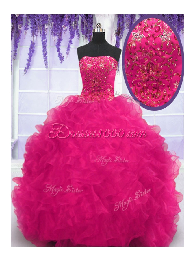 Fuchsia Strapless Neckline Beading and Ruffles Quinceanera Gown Sleeveless Lace Up