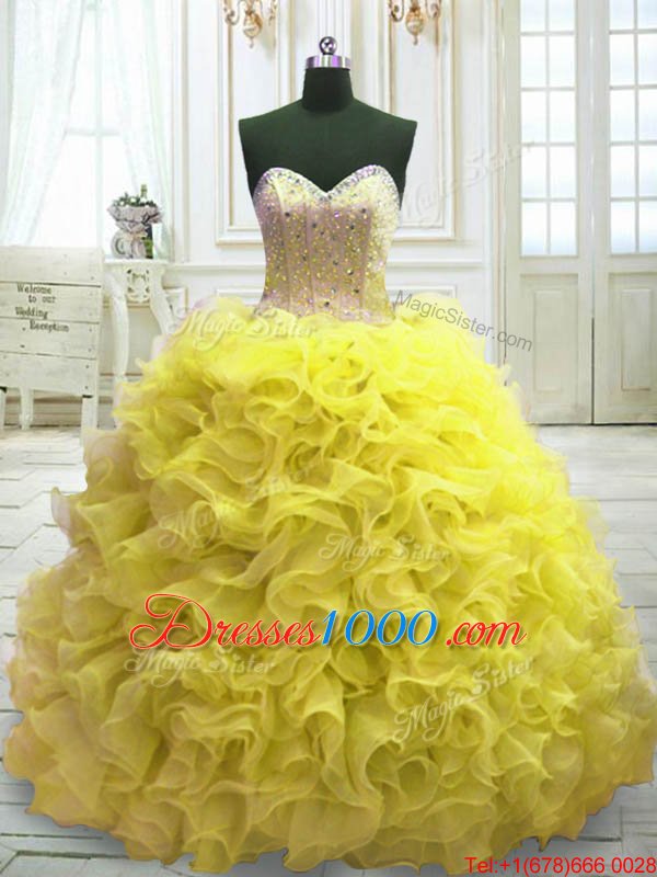 Glamorous Beading and Ruffles Sweet 16 Quinceanera Dress Yellow Lace Up Sleeveless Sweep Train