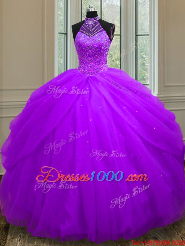 Elegant Halter Top Floor Length Lace Up Sweet 16 Quinceanera Dress Purple and In for Military Ball and Sweet 16 and Quinceanera with Beading and Sequins